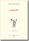 Barbarie , XIX Premio AlegrÃa de PoesÃa del Ayuntamiento de Santander, refleja no solo el tono vitalista, desarraigado y desolador que el poeta descubre en la existencia humana, sino una manera de acercarse crÃticamente a determinados temas de la misma realidad circundante, siempre en una búsqueda por encontrarse a sà mismo. Sin que pierda en ningún momento la emoción, en el libro destacan tanto el entramado de culturalismo y cotidianidad como una gran soltura en el manejo de los aspectos metaliterarios -sus lecturas, los autores que él admira-, un metalenguaje poético abierto siempre al concurso del lector, a una visión colectiva de la realidad. Andrés GarcÃa Cerdán. (Fuenteálamo, Albacete, 1972), es doctor en Literatura por la Universidad de Murcia y profesor de instituto. Ha publicado varios poemarios y ensayos, con los que ha obtenido diversos premios literarios. Fundador de las revistas Thader , Los Deseos , Magia Verde y codirector de Fractal PoesÃa . También ha cultivado la música, editando en 2013 su primer disco, Grizzly! (Parrix&Perdido) , con la banda de indie-rock Leñadores .